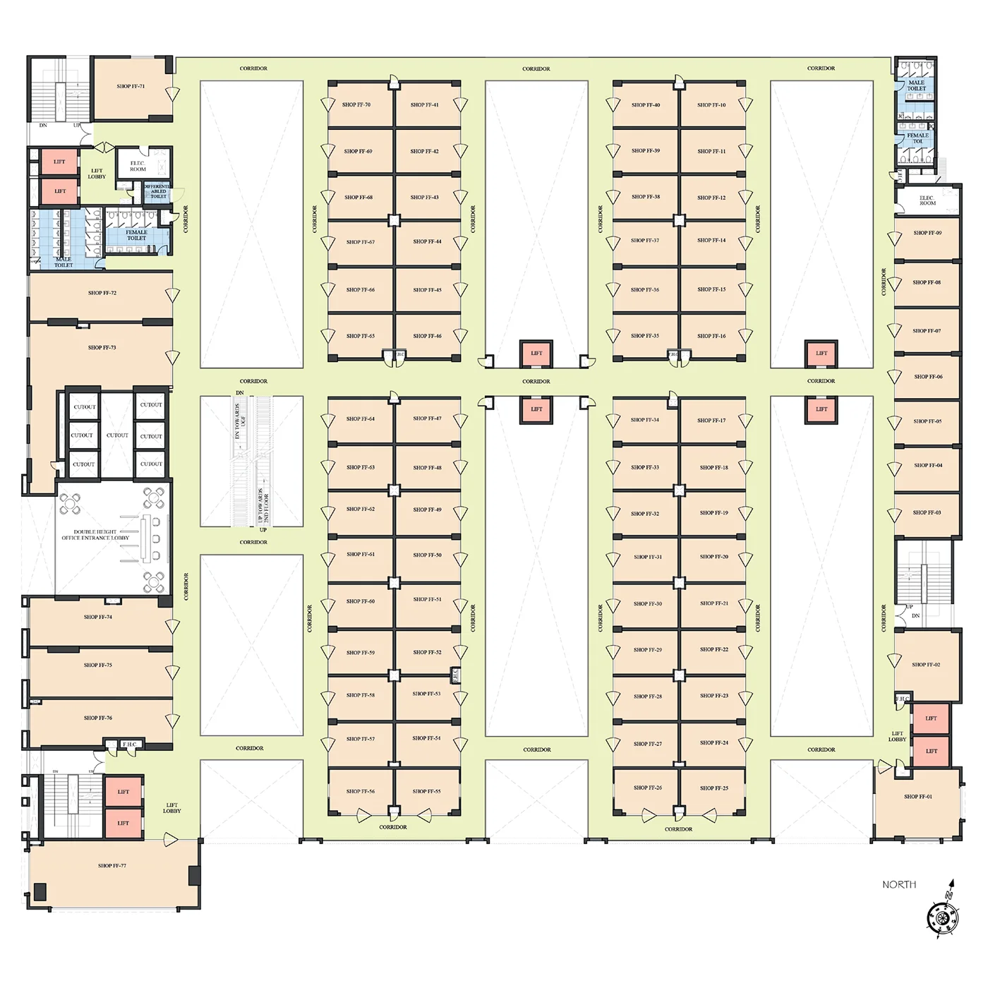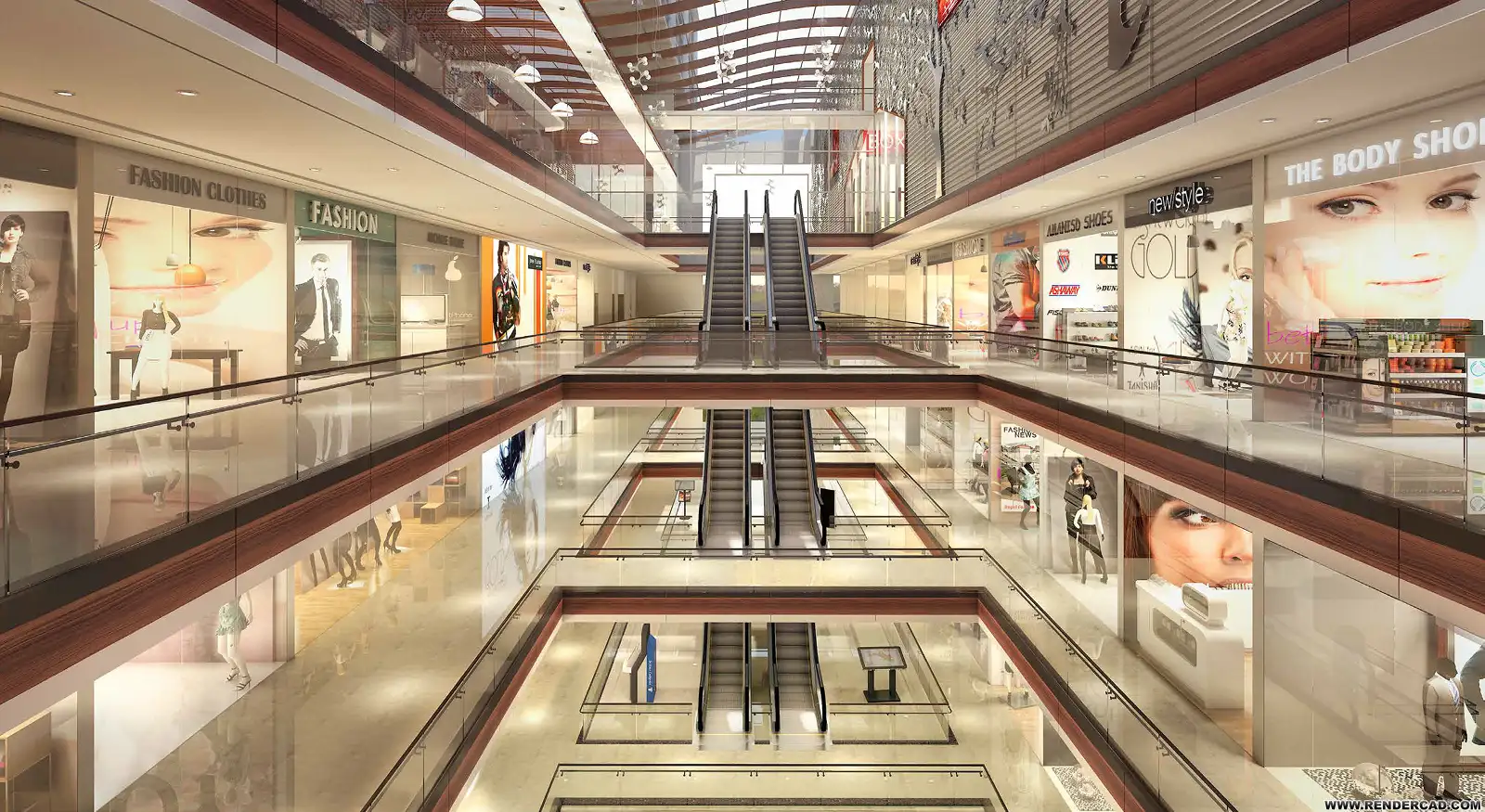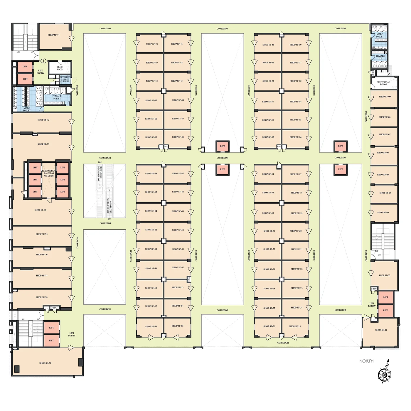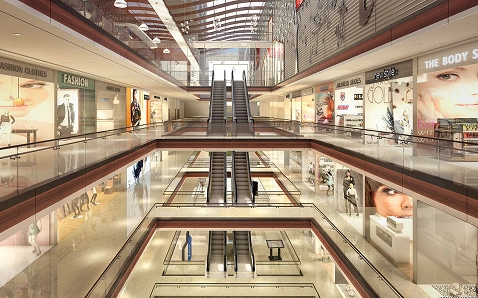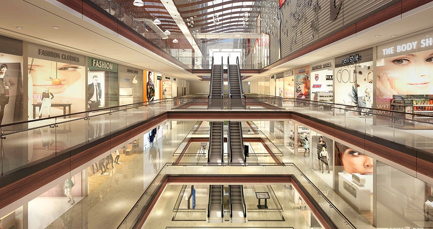 RCC slab and column structure with block work, escalators and staircases connected to retail levels.