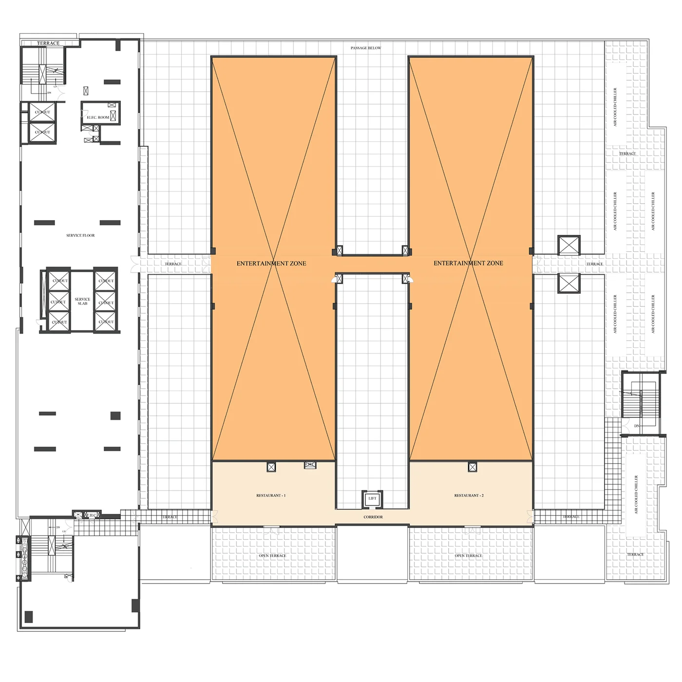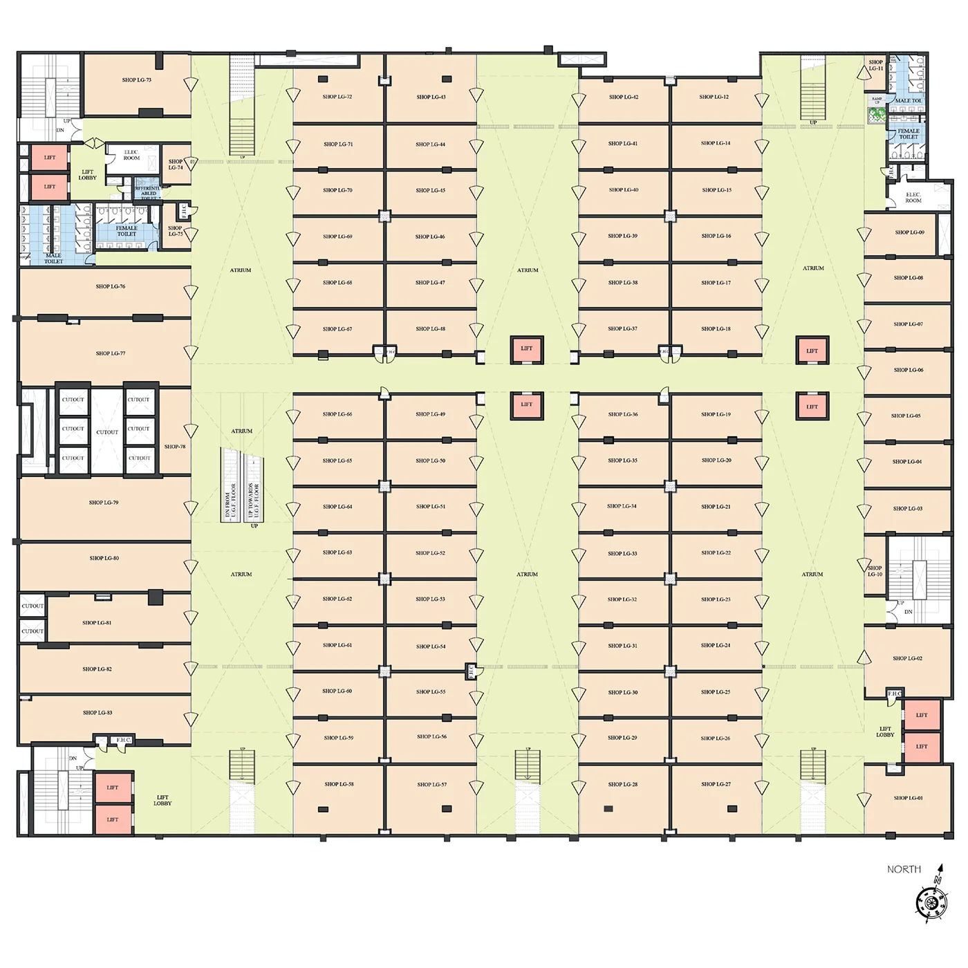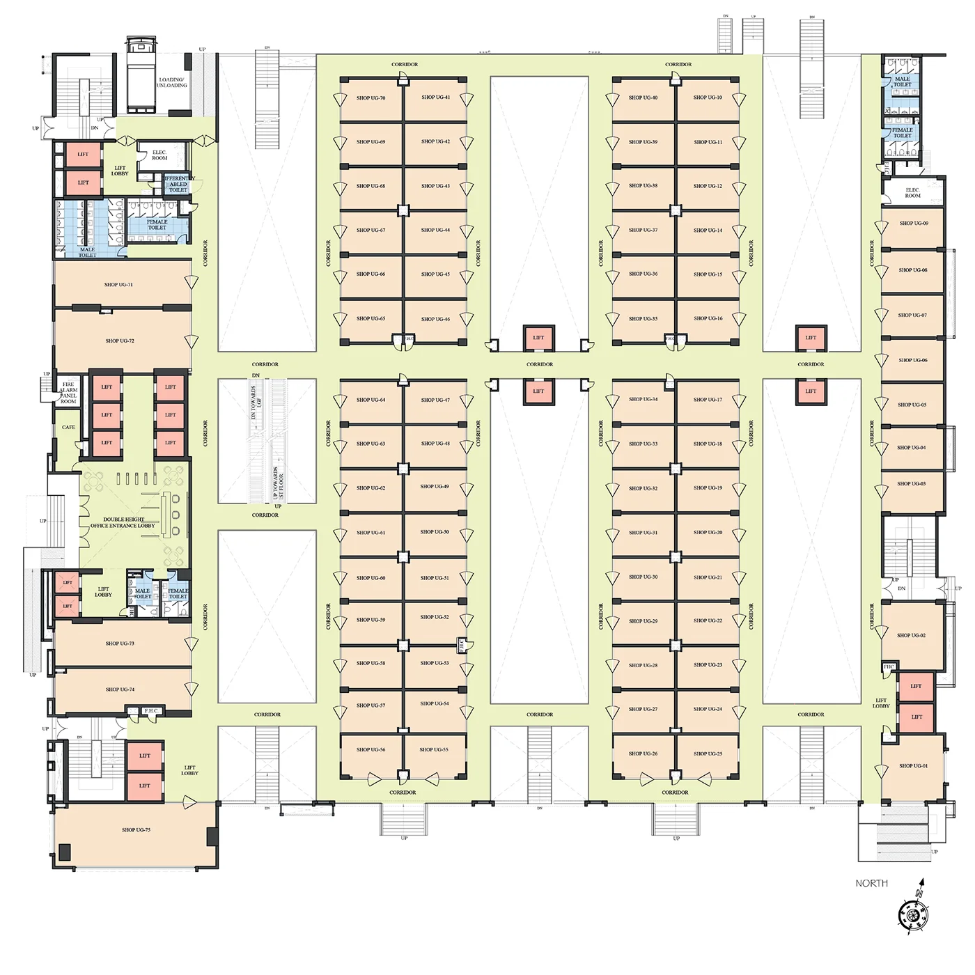 RCC slab and column structure with block work, escalators and staircases connected to retail levels.