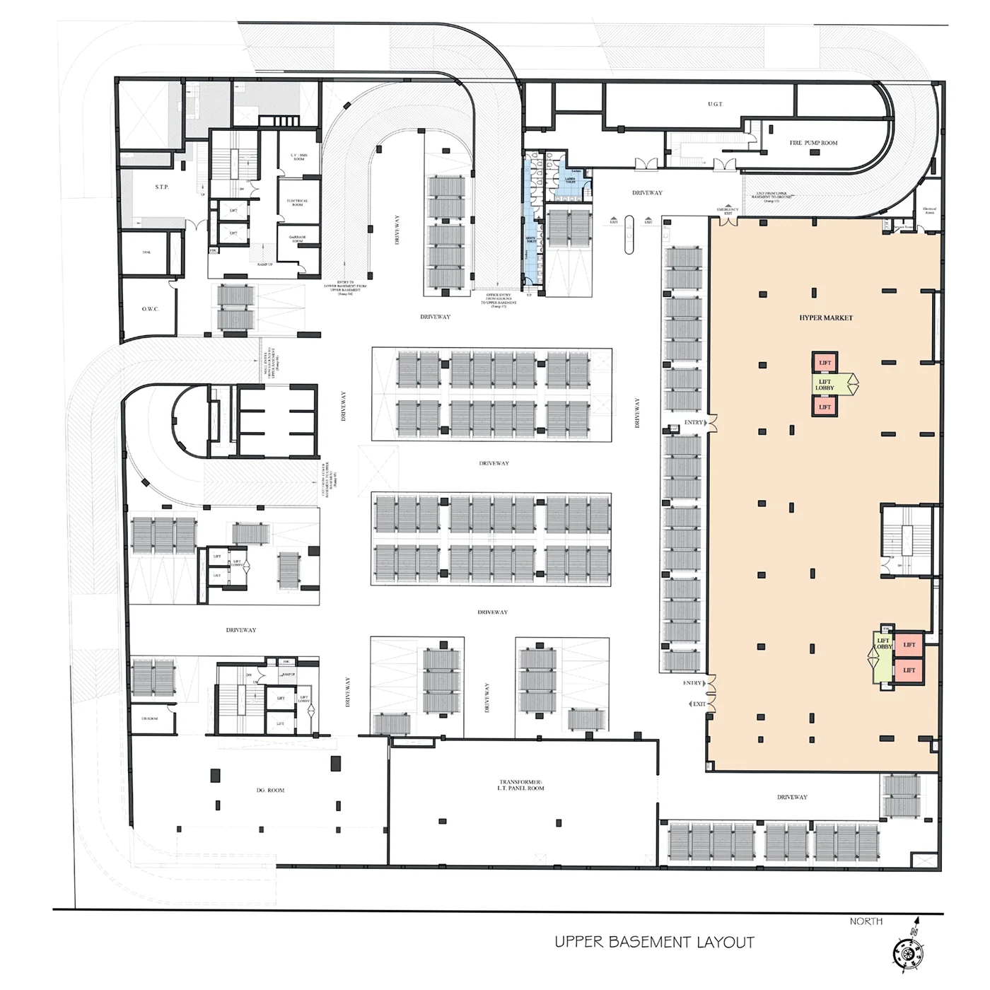 Spacious basement for parking and services with provision of video surveillance as well
